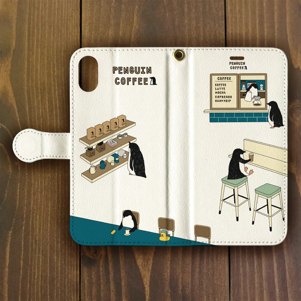 【iPhone11Pro 対応】手帳型ペンギン・コーヒーiphone用手帳型ケース【各機種あります】